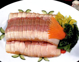 '1.选料:选用新鲜猪体中部的五花腩肉,肥瘦适中者最佳。
