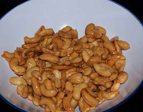 挂霜腰果:'1.炒锅置于中火上,注入花生油,冷油放入腰果仁,控制油温四成时,养炸3至5分钟,见腰果仁颜色略变,立即捞出沥干油。2.炒锅回火上,放清水20克加入白...    详细介绍
