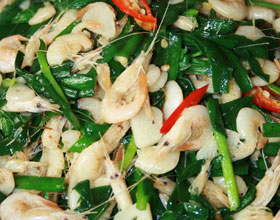 韭菜炒虾丝:'1.虾仁洗净,沥干水分,从脊背切开(不要切断),抽去虾筋,摊开切成细丝;2.将韭苔洗净,沥去水分,切成2厘米长的段;3.葱洗净,切丝;4.姜去皮洗净切...    详细介绍