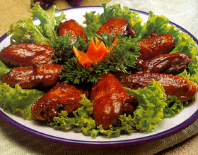 贵妃鸡翅:'1.将胡萝卜切成厚菱形块,焯水待用。将鸡翅洗净,改刀,入碗,加料酒、味精、精盐、胡椒粉、花椒略腌制30分钟,下入沸水锅中焯水。姜洗净拍松;葱洗净...    详细介绍