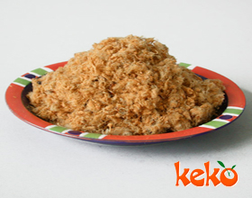 3.焙松:将肉泥放入锅内,取熟面粉和熟豆油继续拌合,约经40分钟全部倒完,继续焙松。待出锅前,再把味精、白糖、红曲一并倒入并拌匀,使制品呈松散油润的颗粒状即可出锅。稍晾凉,过细箩筛后的细粒即为成品。