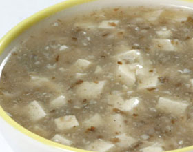 紫菜豆花羹:'1.将紫菜浸泡洗净,切成碎粒;2.豆花(南豆腐)切成小方粒;3.锅内加清汤烧沸,放入紫菜、豆花煮熟,加入盐、味精、胡椒粉调味,用湿淀粉勾芡;4.将鸡...