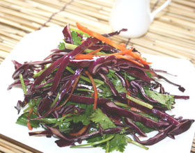 6.把甘蓝放盘内,上面放红椒丝、香菜段,再撒上味精、麻油、姜末、蒜丝即成。