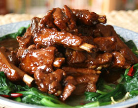 年年高升:'1.小排骨先氽烫过,去除血水后冲净泡沫,沥干,放锅内,加入调味料(酒1大匙、醋2大匙、糖3大匙、酱油4大匙、清水2杯)烧开后,改小火慢慢烧至汤汁收...    详细介绍
