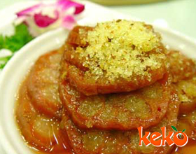 桂花糯米藕:'1.将藕洗净,切去一端藕节(藕节留着待用),使藕孔露出,再将孔内泥沙洗净,沥干水分,冰糖砸碎待用。2.糯米淘洗干净,晾干水分,由藕的切开处把糯米灌...    详细介绍