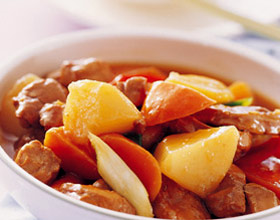 主料: 猪肉(肥瘦}75克 土豆(黄皮)75克 茄子75克 胡萝卜75克 番茄75克 青椒50克 黄瓜75克