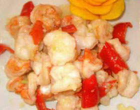 4.勺中留底油,加葱段、姜末烹出香味,放配料煸炒,加高汤30克和调料调味,加入虾仁,淋明油颠翻出勺。