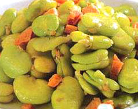 3.炒锅置中火,下入熟猪油,烧至四成热,将蚕豆倒入煸炒10分钟;