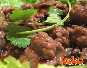 6.余油倒出,炒锅放回炉上,下蒜、姜、葱爆至有香味,放入牛肉片,烹黄酒,用芡汁勾芡,淋油炒匀,迅速盛碟便可。