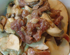 肉片白蘑:'1.将白蘑洗净抹刀片成片。猪肉洗净切薄片。用10克湿淀粉上薄浆;花椒用水浸泡,拣出花椒,花椒水留用。2.炒勺内放猜油烧热,下入葱、姜末及浆好的肉片...    详细介绍