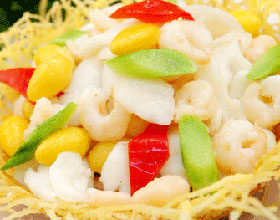 鹊巢虾仁:'1.将鸡蛋清、淀粉15克调匀,放入虾仁上浆;2.土豆切成5 厘米长的丝;3.鸡蛋置碗中,加入淀粉30克、面粉、精盐、味精调匀;4.蛋碗内再放入土豆丝拌匀挂...    详细介绍