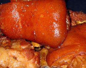 凤蹄:'1.将猪蹄刮洗干净,剖开至骨,斩下脚爪,同放入炒锅,舀入猪肉汤,放在旺火上烧沸,撇去浮沫,捞出洗净;2.猪蹄仍放锅中,加黄酒、精盐、葱段、姜块烧...    详细介绍