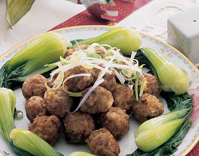 9.将肉球捞起,摆至盘中,淋上炖肉汁,即可食用。