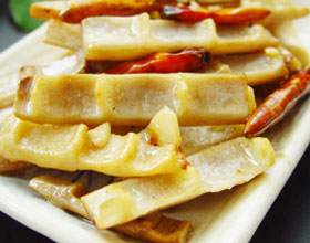 3.锅留底油烧热倒入春笋,再加老抽,糖,味精和适量水,用小火焖烧至水分基本收干后,淋些明油装盘即可。
