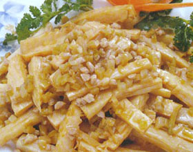 干煸冬笋:'1.将冬笋洗净,沥干水分,切成长4厘米、宽1厘米的条;2.猪瘦肉洗剁碎备用;3.榨菜洗净,切碎,待用;4.炒勺置旺火上,下猪油烧至六成热,放入冬笋炸至...    详细介绍