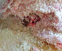 2.将每只剪净明虾从肚部切开两边,不可切断,用淀粉涂匀肚内,瓤入猪肉馅30克,抹上鸡蛋,拍上面包屑;