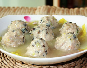 山东蒸丸:'1.猪瘦肉剁成细泥;猪肥肉先剞十字花刀,再切成细粒;大白菜去老帮留白菜心切末;水发海米切末;水发木耳切细丝。2.将第一步骤中的原料混合一起再加入...