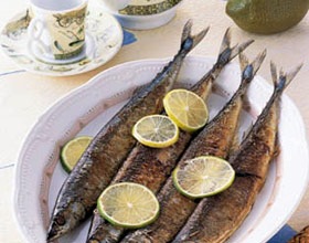 烤秋刀鱼:'1.秋刀鱼清洗净后,抹上酒、盐、胡椒粉腌10分钟左右;2.将腌好的秋刀鱼放在烤架上,以中火烤20分钟即可。...